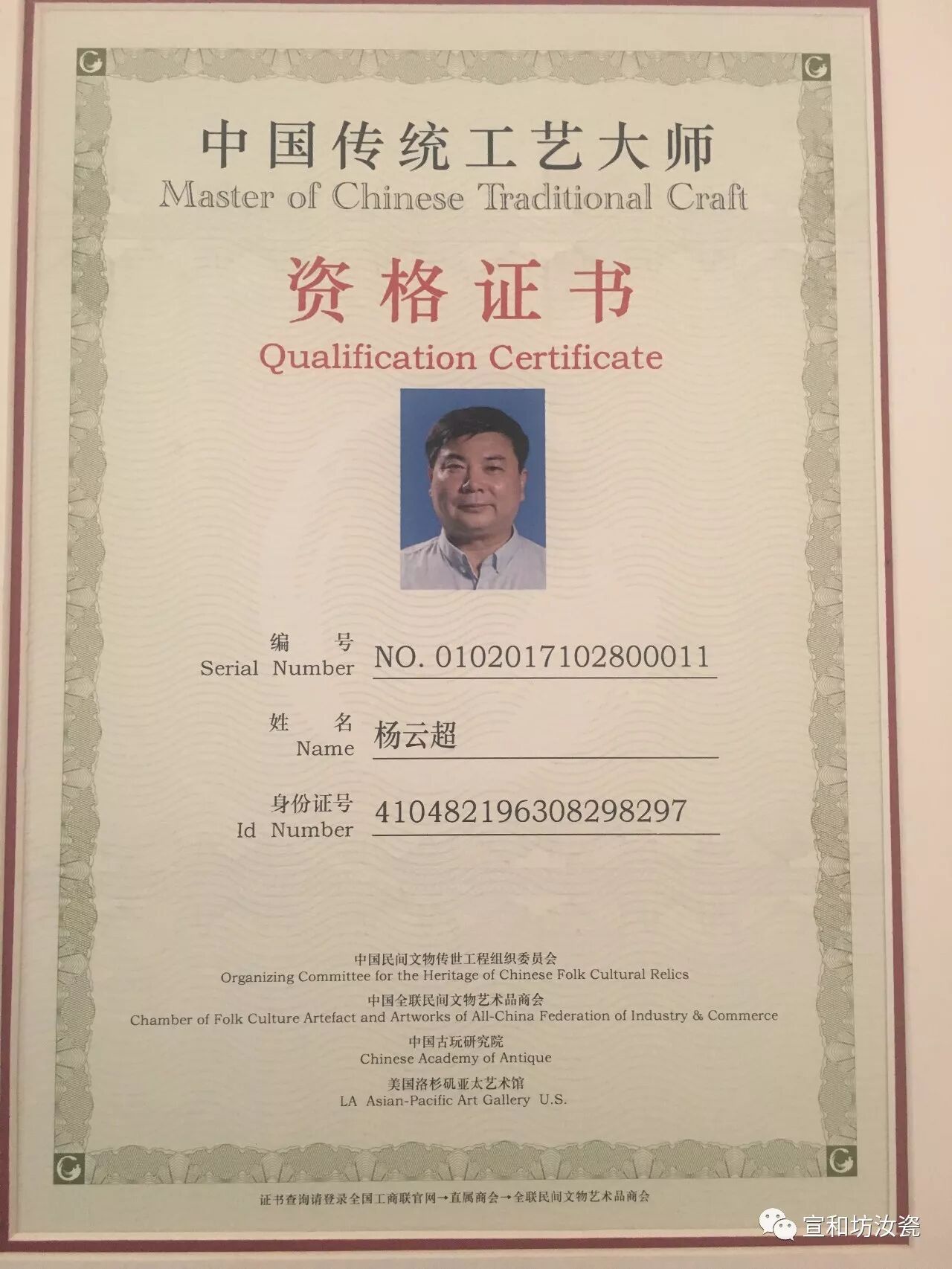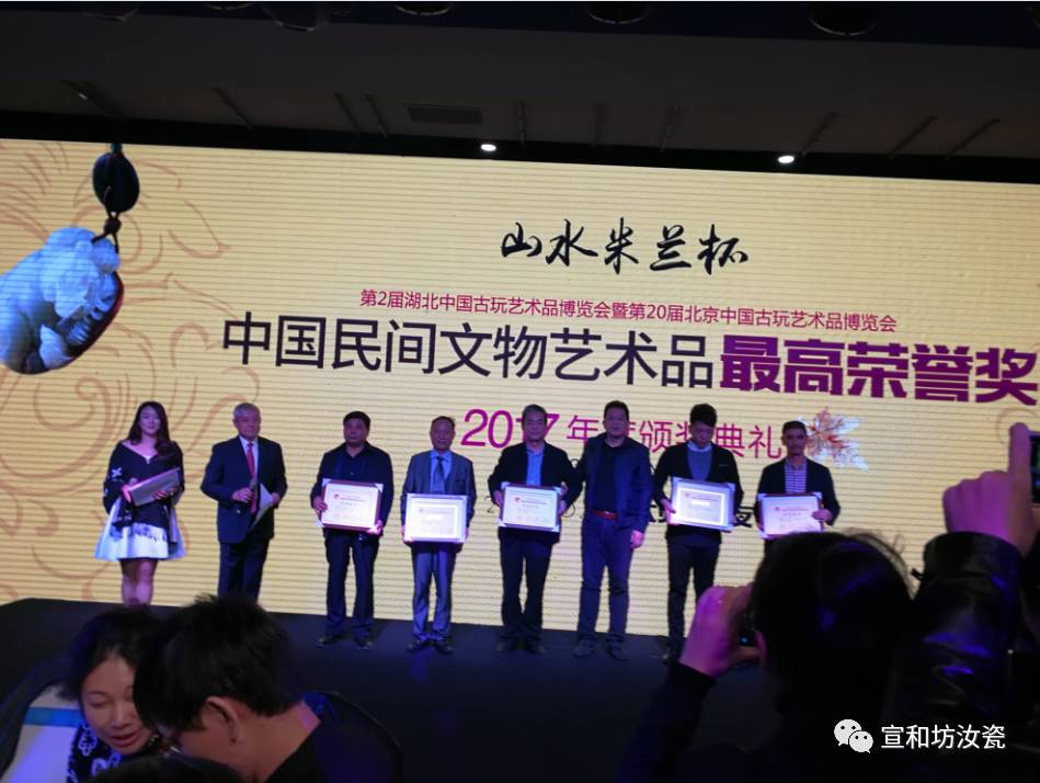 2017年10月29日,由民间文物传世工程组织文员会、全联民间文物艺术品商会、古玩研究院、美国洛杉矶亚太艺术馆承办的第二届湖北古玩艺术品博览会第20届北京古玩艺术品博览会。宣和坊汝瓷执行董事杨云超荣获民间文物艺术品最高荣誉奖