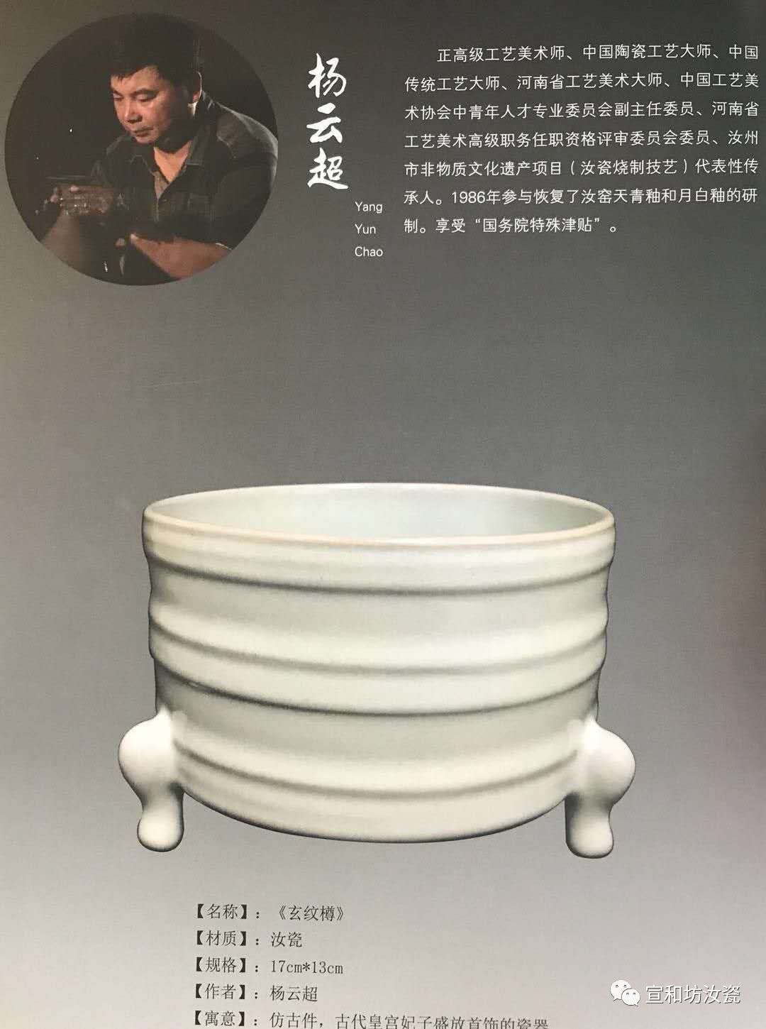 杨云超1983年9月在汝州市工艺美术汝瓷厂参加工作,先后担任厂技术员、设计室主任、玻璃工艺研究所所长、样品部部长等职务。1986年参加了原临汝县工艺美术厂汝窑天青釉和月白釉的研制,并通过了原国家轻工部和省科委组织的技术鉴定,填补了我国陶瓷史上的空白。1988年由于他对汝官窑天青釉与月百釉研发过程中的突出贡献,被汝瓷厂保送到郑州轻工业学院工艺美术系学习深造。在数十年的工作中,他系统熟练掌握了汝瓷生产环节中的各种工艺。2005年3月自主创办了汝州市宣和坊汝瓷有限公司。